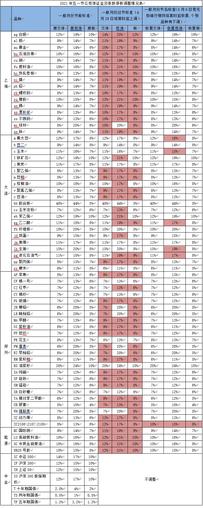 ? ? 二、我公司自4月29日(星期四)結(jié)算時起調(diào)整部分品種保證金標(biāo)準(zhǔn)和下一交易日起的漲跌停板幅度,5月6日(星期四)若無極端行情則結(jié)算時起下調(diào)部分品種保證金標(biāo)準(zhǔn)和下一交易日起的漲跌停板幅度。詳情如下: